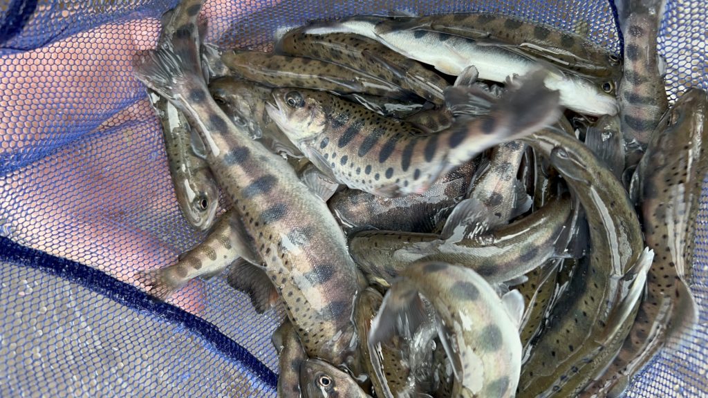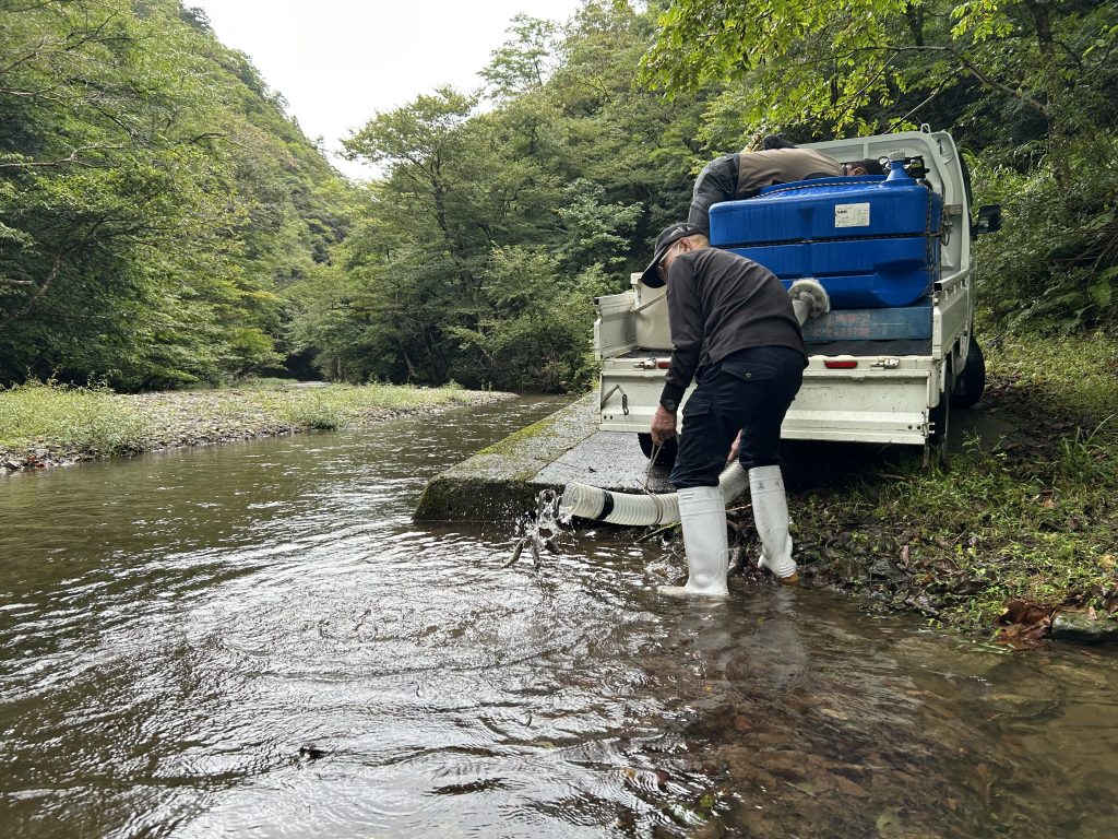 ヤマメ50㎏放流しました! 未分類 2025.09.292025.09.30 2025.9/29㈪本日元気いっぱいのヤマメの放流が完了しました。今回の放流したのは(平均)全長16㎝/25gのヤマメ。合計約50kgのヤマメを広野ダム、田倉川に放流し元気に泳ぎ出しました。放流した瞬間勢いよく上流へと泳ぎ、透明度の高い水中でその姿がはっきりと見えるほどです。ヤマメのかわいい模様が更に美しく光っていました。釣り人の皆さんに楽しんでもらえる日が待ち遠しいですね♪